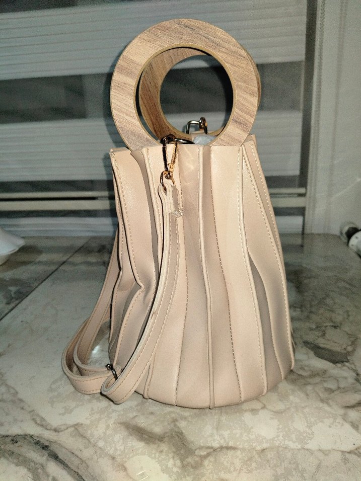 Bej renkli deri çanta, pliseli tasarım ve ahşap yuvarlak saplara sahip. Pastel tonlarda, bohem tarzda ve günlük kullanıma uygun.