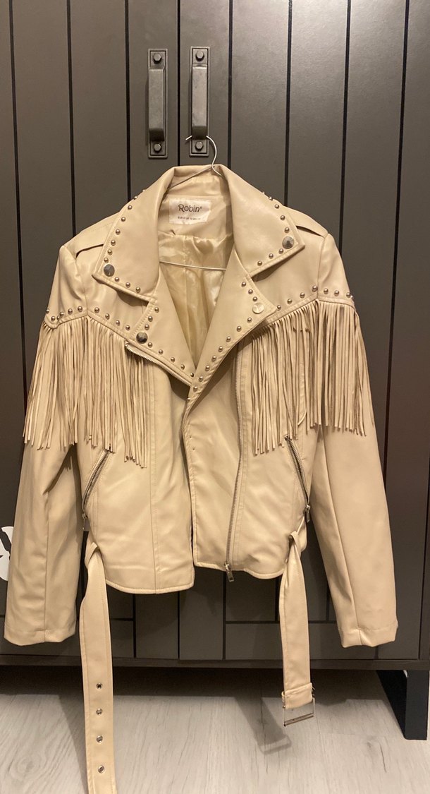 Bej deri, perçin detaylı ve püsküllü biker ceket. Kuşaklı bel ve dar kesimiyle bohem ve retro tarzı yansıtır.