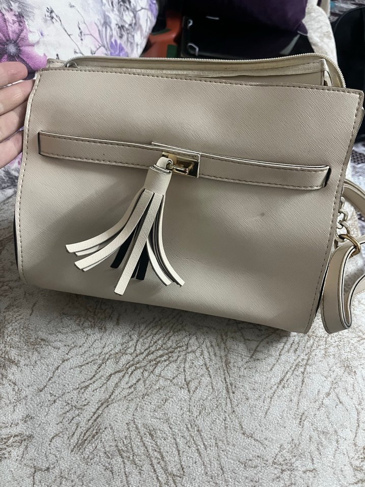 Bej deri kadın çanta, püskül detaylı ve desensiz tasarıma sahip. Günlük kullanıma ve trend sokak stiline uygundur. Sorunsuzdur