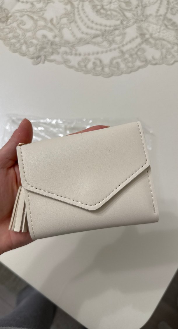 Açık bej renkte deri kadın cüzdanı, püskül detayıyla. Düz ve desensiz, bohem tarzda, günlük kullanıma uygun.