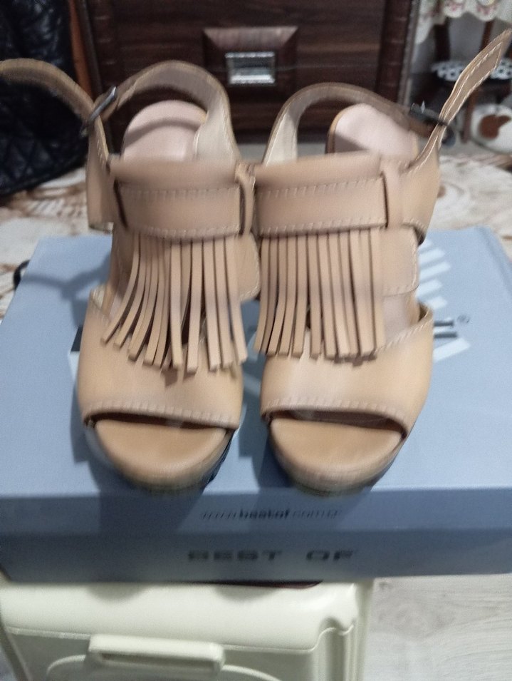 Bej renkli deri kadın dolgu topuklu sandalet, püskül detaylı ve tokalı, bohem tarz için uygun pastel tonlarda.Topuk boyu 10 cm