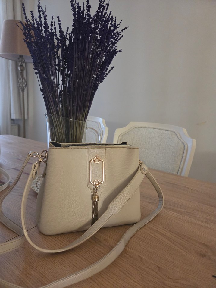 Bej renkli deri kadın çanta, püskül detaylı ve modern klasik tasarıma sahip. Desensiz, pastel tonlarda günlük kullanıma uygun Paris tarzı.
