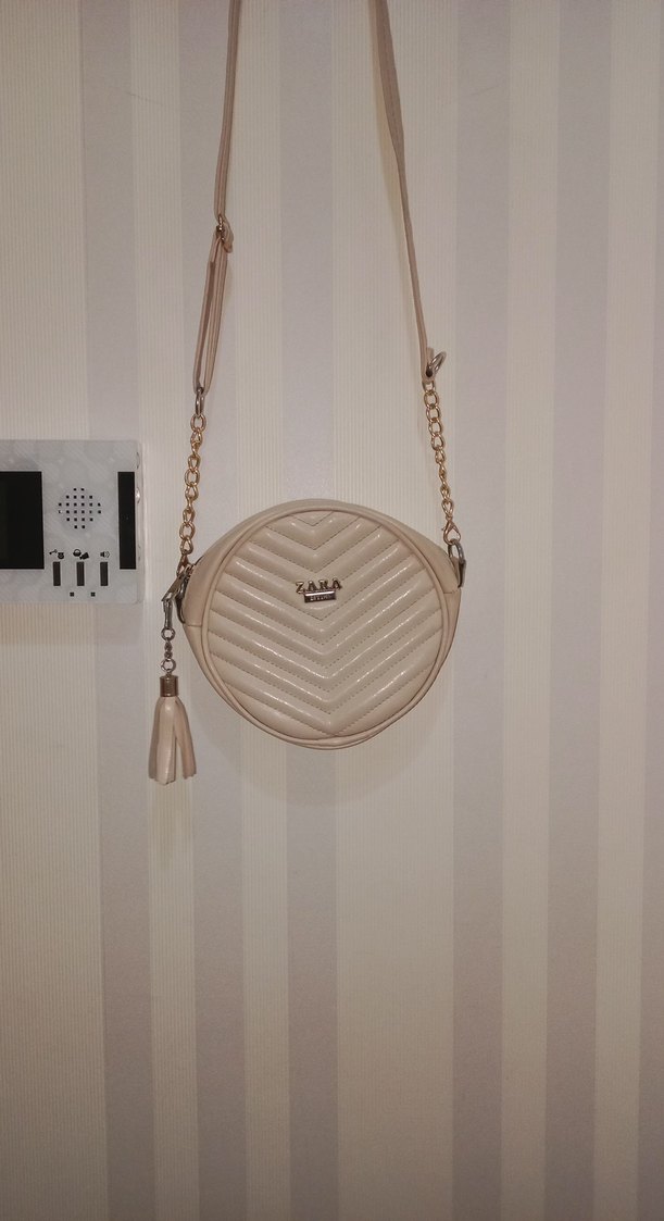 Bej Deri Püsküllü Yuvarlak Kadın Çanta