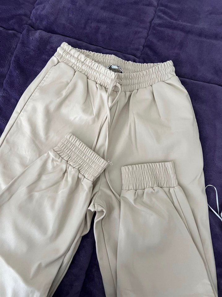 Bej renkli deri, rahat salaş kesim ve midi boyda, lastikli bel kısmıyla konforlu kadın pantolonu. Günlük şıklık için uygun.