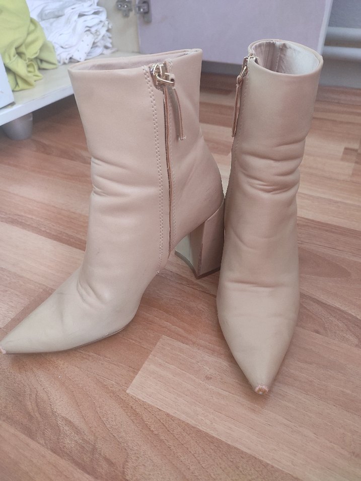 Bej renkli deri kadın bot, stiletto topuklu ve yan fermuarlı. Pastel tonlarıyla desen içermeyen şık tasarım, günlük ve sokak stiline uygun.