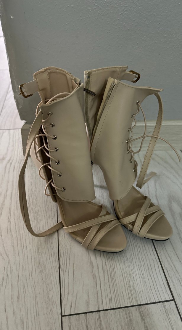 Bej deri kadın botları, stiletto topuklu ve tokalı detaylara sahip, çağdaş avant-garde tarzda tasarlanmıştır. Günlük kullanıma uygundur.