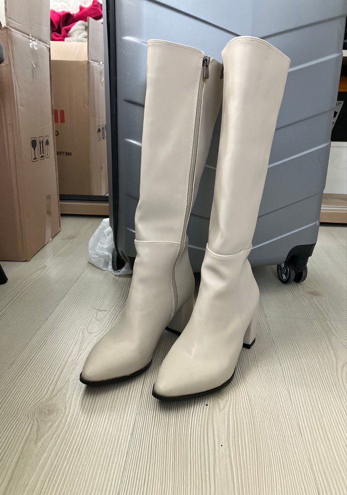 Bej deri dizüstü kadın çizme, ince stiletto topuk ve tokalı detaylara sahip. Günlük kullanıma uygun, Paris tarzı modern ve şık görünüm sunar.