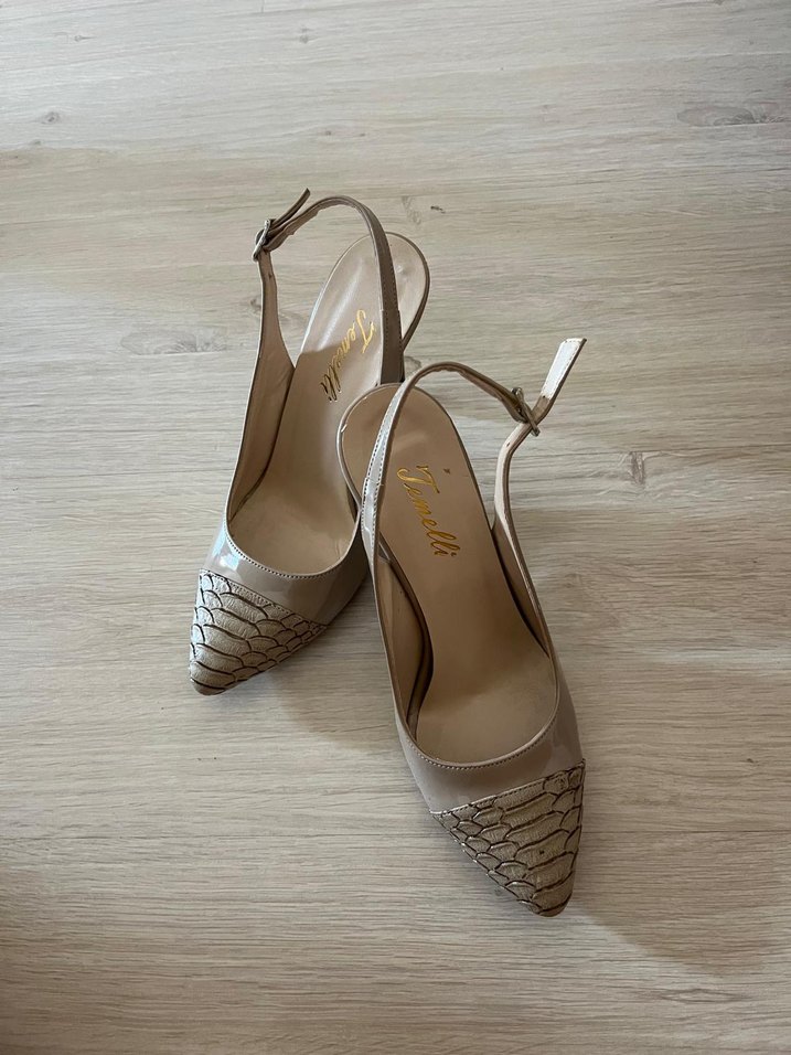Bej deri abiye ayakkabılar, stiletto topuklu, yılan deseni ve tokalı bant ile düğünler için uygun. 37 nodur. Temizdir