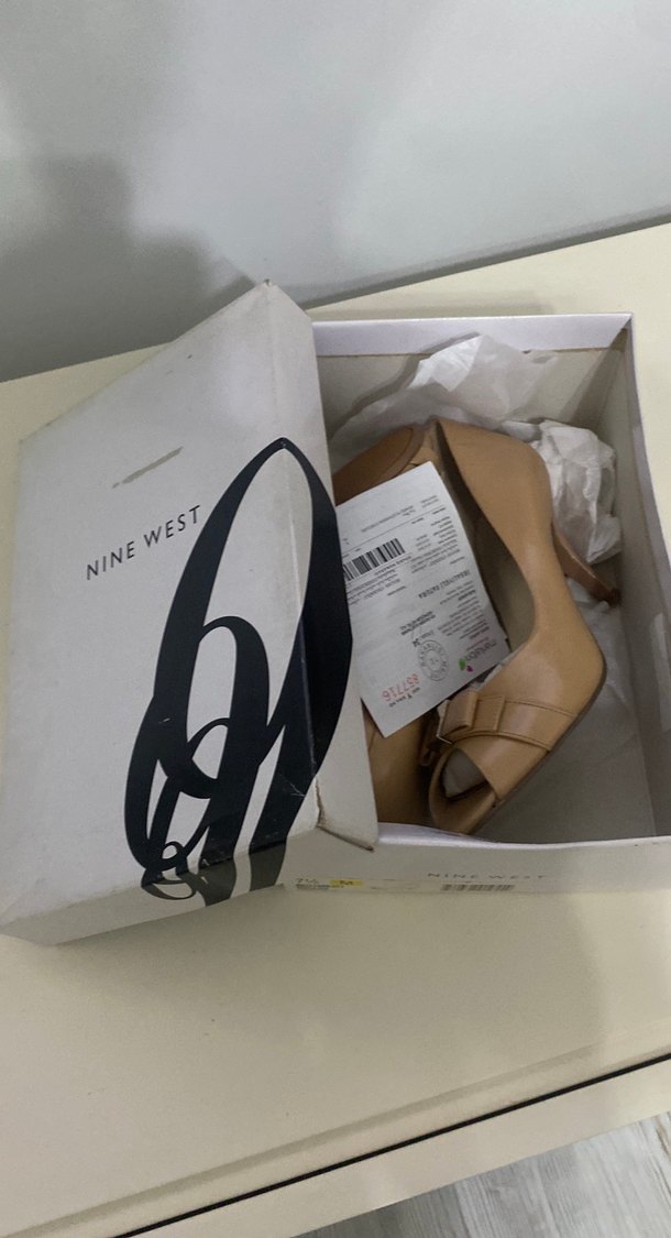 Nine West'in bej deri stilettoları, kemerli ve baskılı desenli olup ofis kullanımı için minimalist tarzda tasarlanmıştır. Hiç kullanılmamıştır ayağım kırıldığı için hiç kullanılmadı