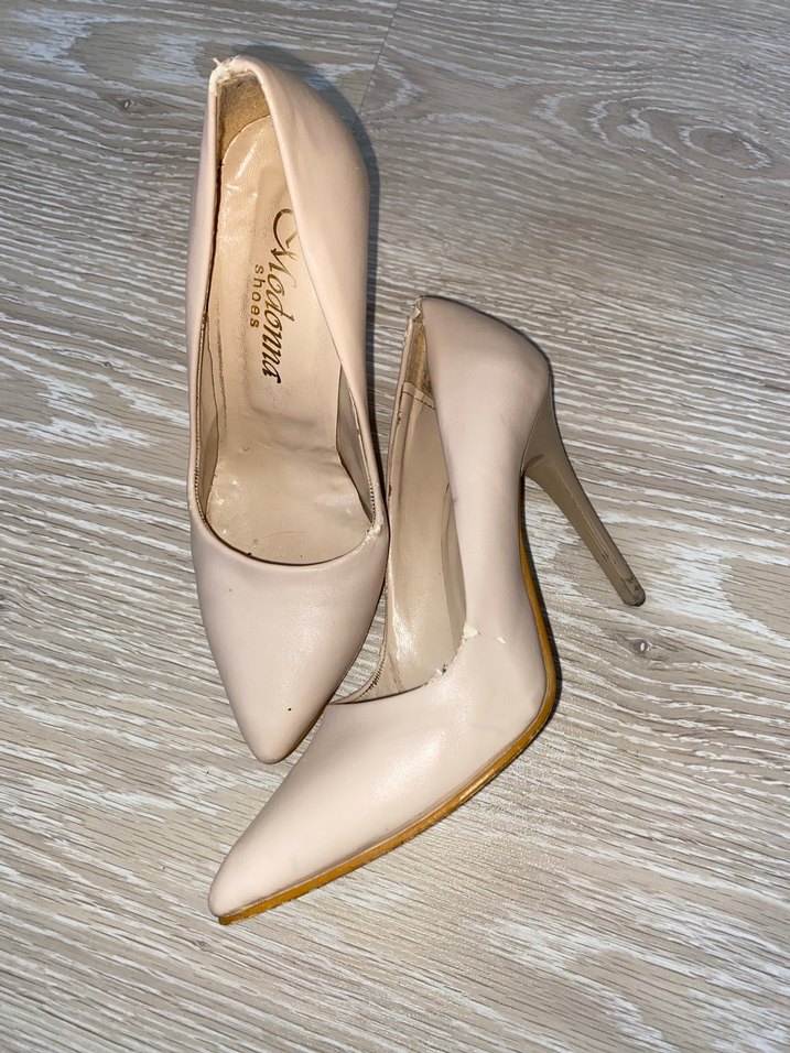 Bej deri stiletto topuklu, sivri burunlu ve bağcıklı detaylı, pastel yılan derisi desenine sahip. Ofis için modern klasik tarzda.