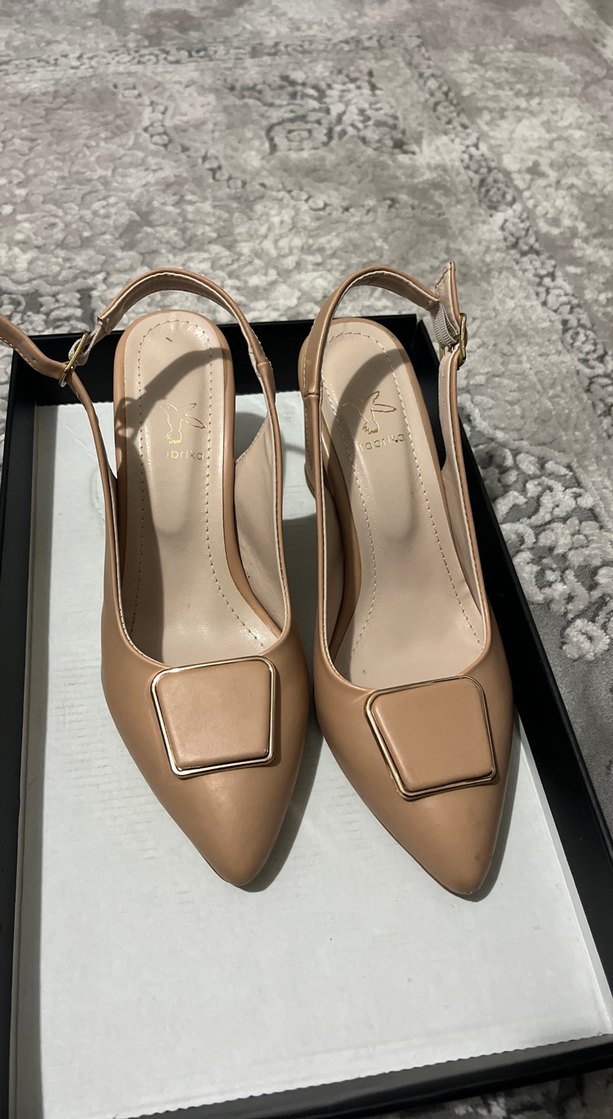Bej deri, toka detaylı, stiletto topuklu kadın ayakkabısı. Modern klasik tasarımıyla ofis kullanımı için uygun. ✨