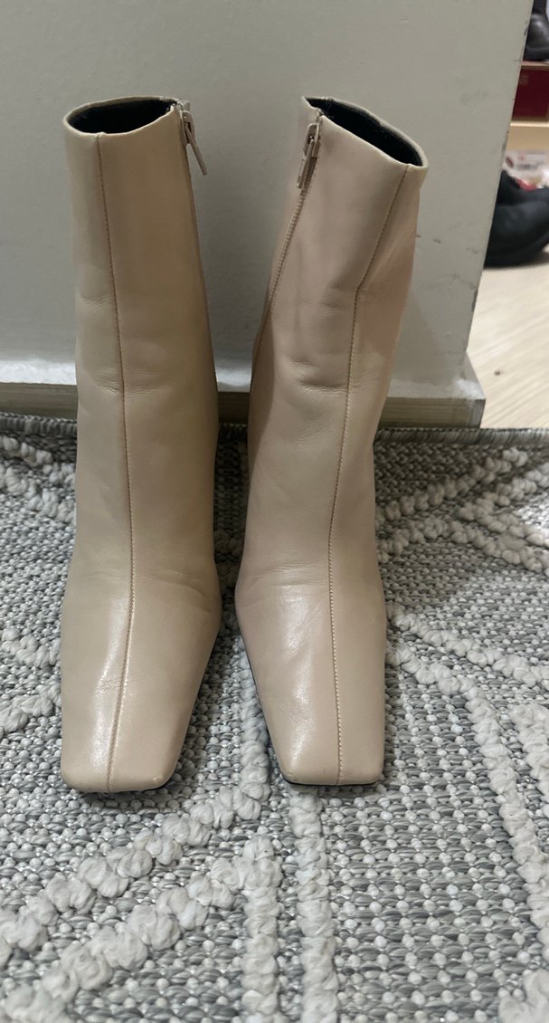 Bej deri stiletto topuklu kadın botlar, düz ve desensiz tasarımıyla dikkat çeker. Günlük kullanıma uygun, çağdaş ve zahmetsiz şıklık sunar.