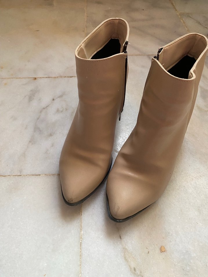 Bej deri, stiletto topuklu, tokalı kadın botu. Minimalist ve çağdaş tarzda, günlük kullanıma uygun.