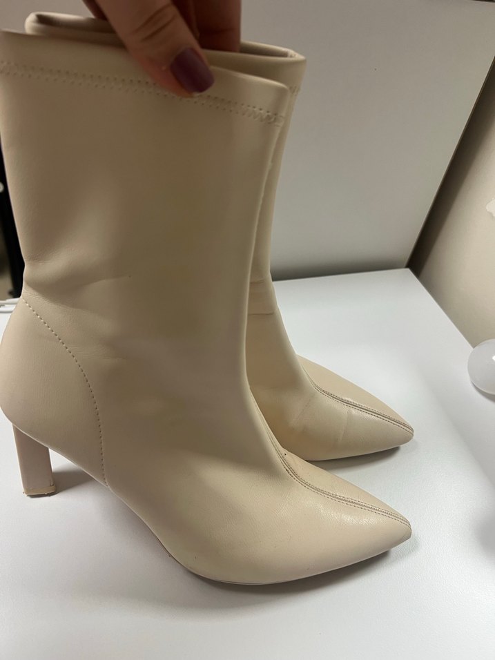 Bej deri kadın bot, stiletto topuklu ve bağcıklı detaylı, çağdaş klasik zarafeti yansıtan hafif tasarım. Sadece bir kere giydim