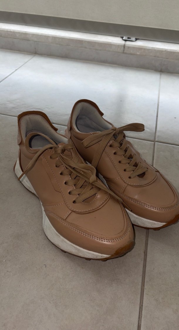 Bej deri kadın spor ayakkabısı, stiletto topuklu, günlük sokak stiline uygun şık ve rahat bir tasarıma sahiptir.