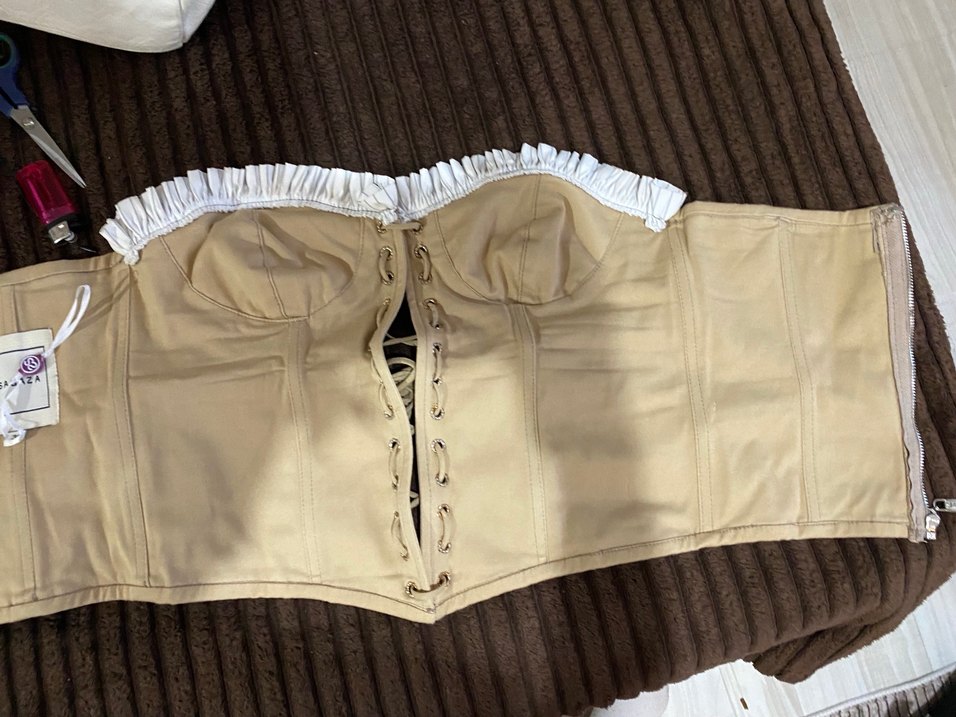 Bej deri, straplez ve fırfırlı detaylara sahip, bele oturan bu büstiyer günlük sokak modası için uygundur.