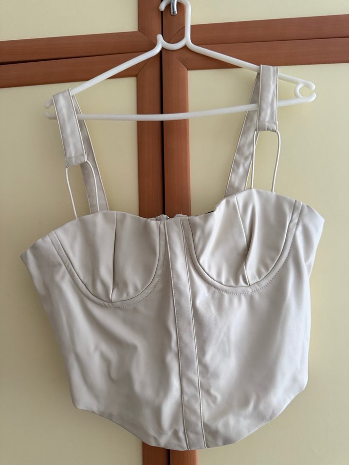 Bej deri, askılı ve kısa kesim, vücuda oturan bustiyer. Minimalist ve şık tarz için uygun, desensiz tasarım.
