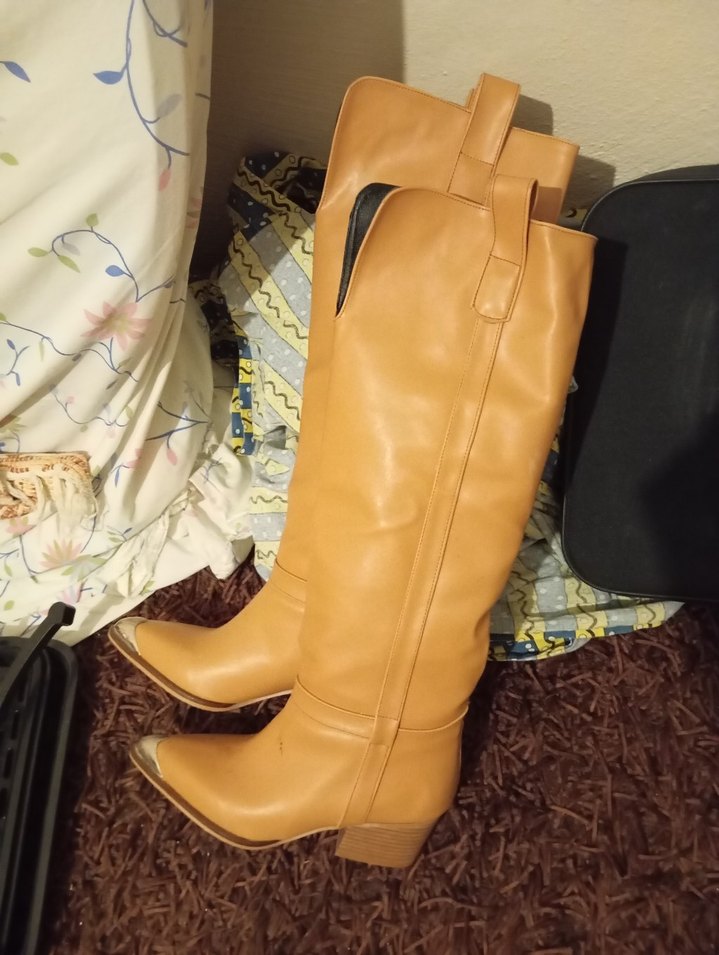 Bej deri, tokalı ve dolgu topuklu diz boyu kadın botları, bohem ve retro tarzlar için uygundur. Düz ve desensiz yapıya sahiptir.