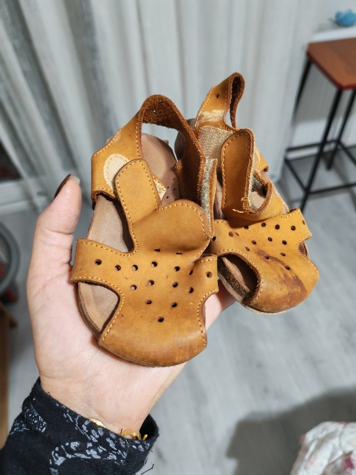 Bej deri, tokalı erkek çocuk terliği. Parlak yüzeyli, açık burunlu ve delikli sade tasarıma sahip bohem tarzında rahat bir model.