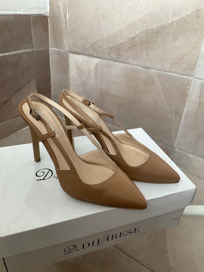 Bej deri, tokalı ince topuklu kadın ayakkabısı. Hafif desenli, klasik ve zarif ofis stili için D.DIVARESE imzası ile.
