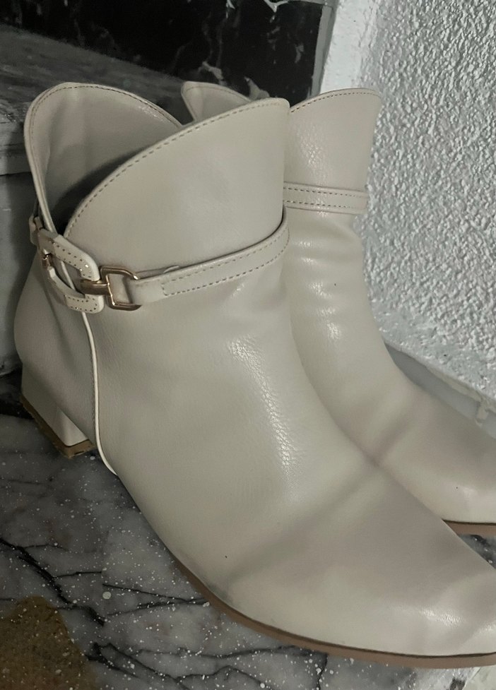 Bej renkte deri kadın botları, tokalı kayış ve kalın topuk detayıyla rahat ve şık bir Paris tarzı sunar.