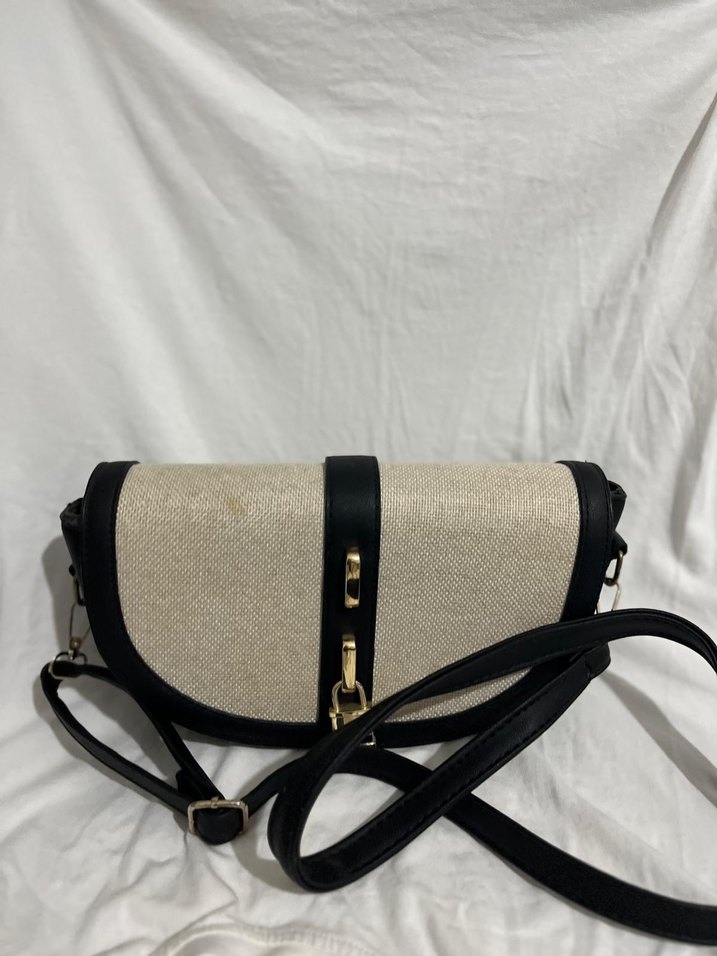Bej deri ve gri detaylı, tokalı kadın çantası. Modern klasik tarzda, Paris esintili, günlük kullanıma uygun.