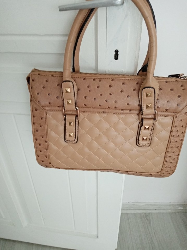 Bej deri tokalı kadın çanta, parlak yüzey ve kapitone ön cep detayına sahiptir. Günlük kullanım için çağdaş Paris tarzında tasarlanmıştır.