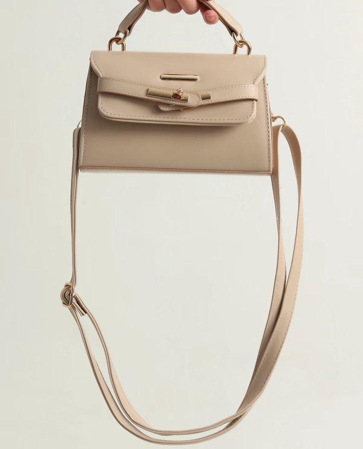 Bej deri tokalı kapaklı, saplı ve ayarlanabilir askılı modern klasik kadın çantası.