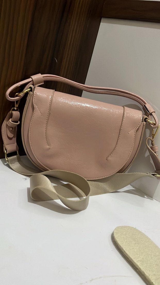 Bej renkte deri, tokalı, modern klasik tarzda, pastel tonlu ve desensiz kadın çantası. İster kol ister çapraz olarak kullanıma uygundur içi astarlıdır