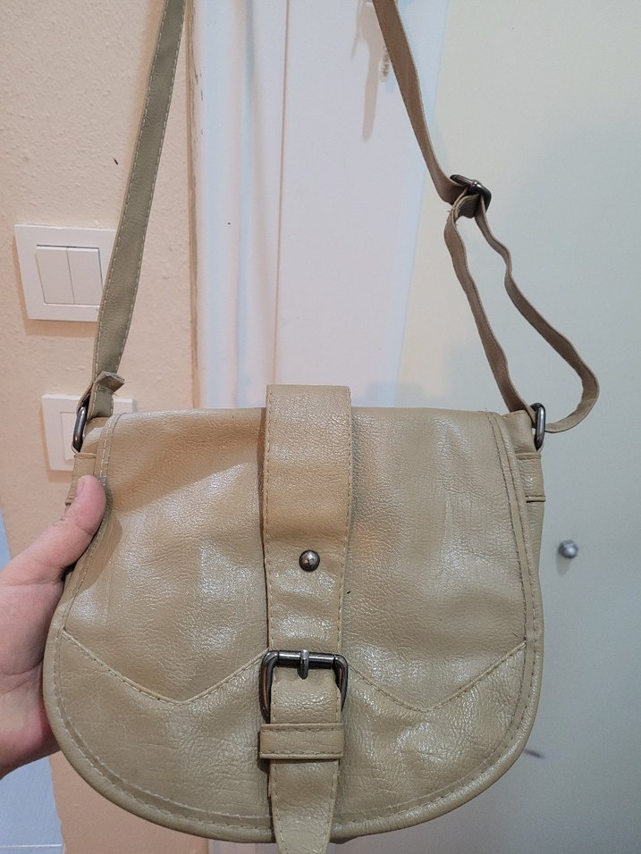 Bej tonlarında, tokalı askısı olan deri kadın çantası. Bohem tarzı ve gri alt tonlarıyla günlük kullanıma uygun, trend bir model.