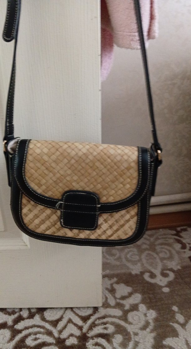 Bej deri tokalı kadın çantası, siyah kenarları ve dokuma dokusuyla günlük kullanım için uygun bohem tarzda.