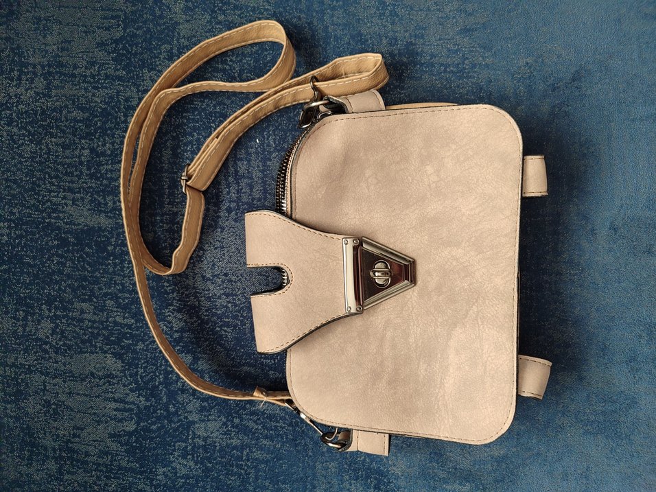 Bej renkte, tokalı kapaklı ve ayarlanabilir askılı deri kadın çantası. Düz yüzeyiyle bohem tarzı yansıtır, günlük kullanım için uygundur.