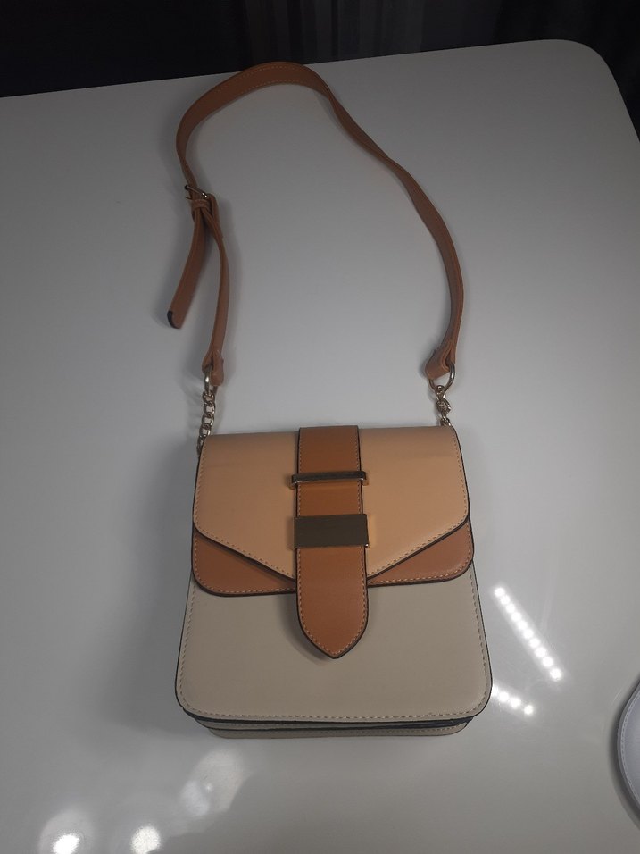 Bej deri tokalı kadın çanta, ayarlanabilir askılı ve modern tasarımlı. Günlük kullanım için uygundur.