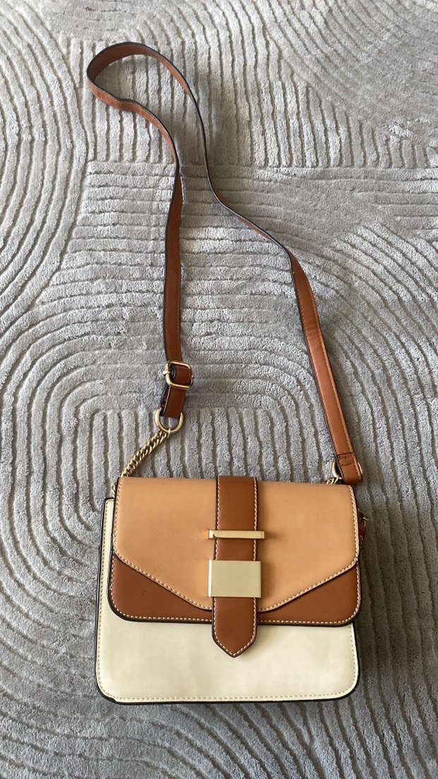 Bej deri tokalı kadın çanta, ayarlanabilir askılı ve desen içermeyen modern bir tasarıma sahiptir. Günlük kullanıma uygundur.