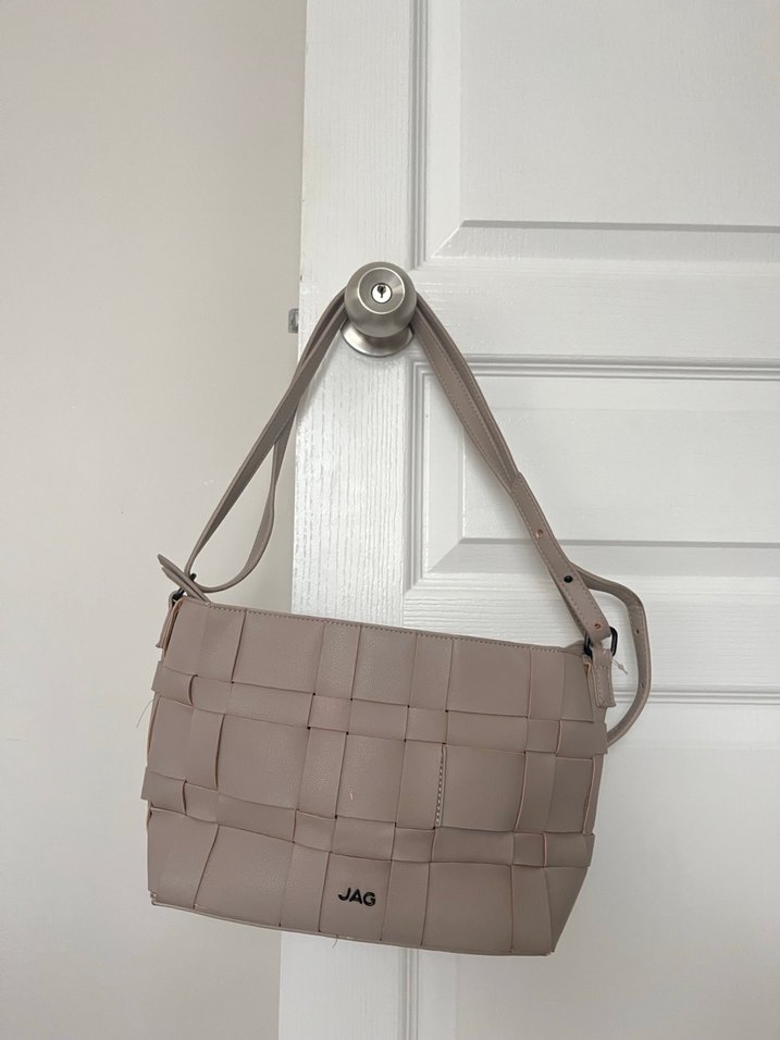 Bej renkli deri çanta, tokalı askısı ve minimalist dokuma tasarımıyla günlük sokak stiline uygun trendy bir model. Önün çok ufak deformasyonu var