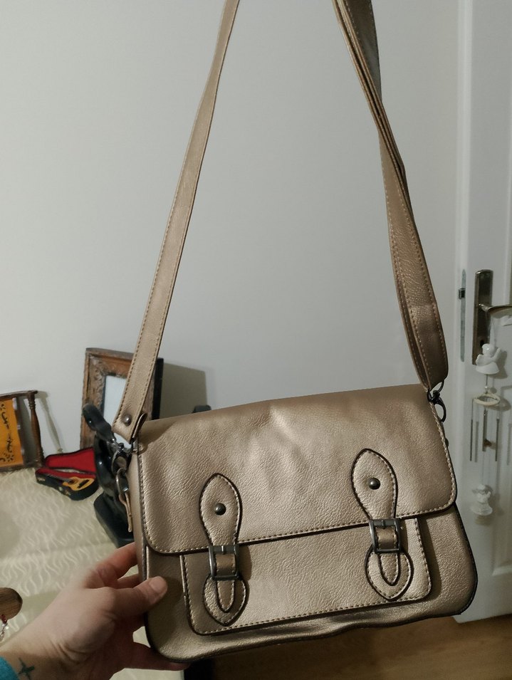 Bej tonlarında deri kadın çantası, tokalı detaylara sahip. Bohem tarzıyla günlük kullanıma uygun sade tasarım.