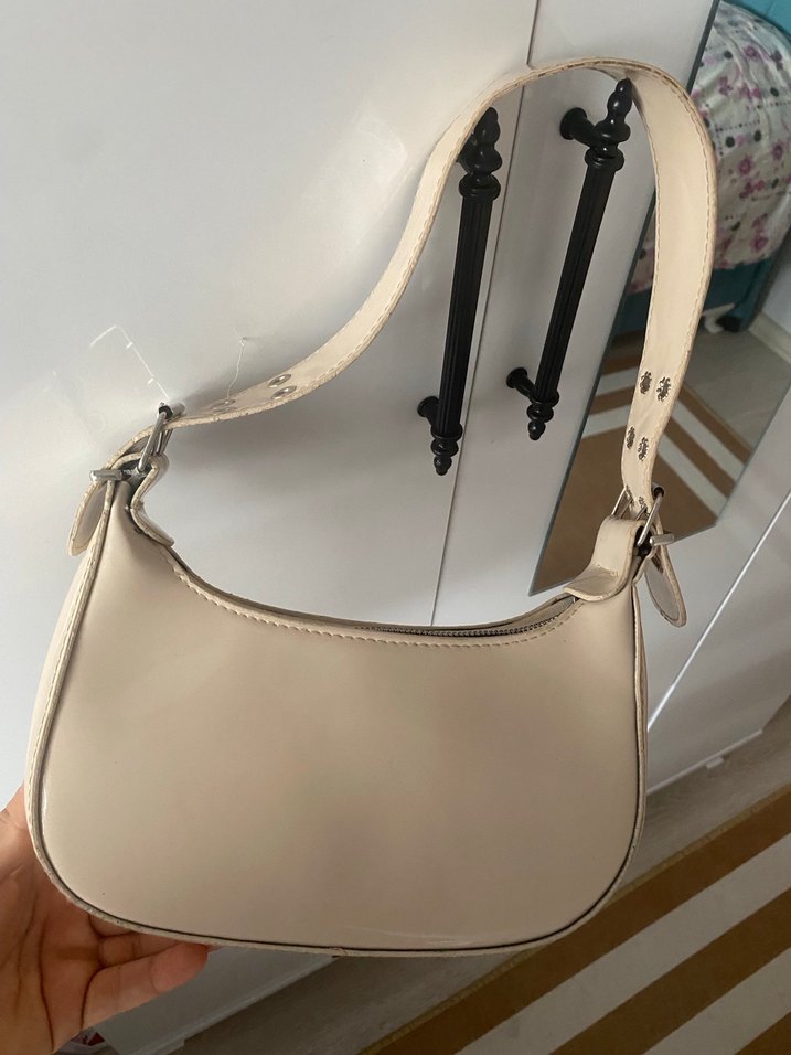 Bej deri malzemeden yapılmış, tokalı askılı, desen içermeyen kadın çantasıdır. Günlük ve sokak stiline uygundur.