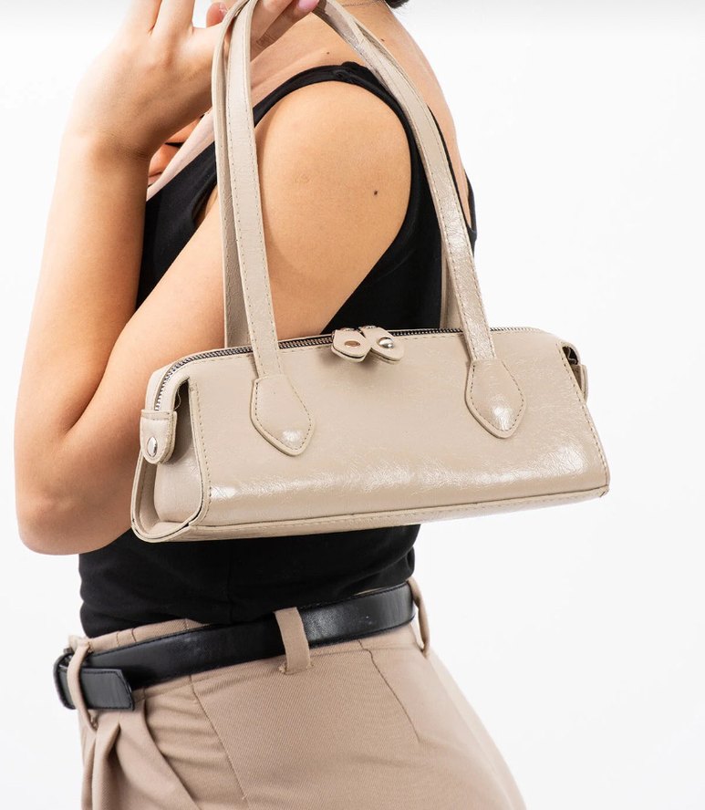 Bej deri, tokalı detaylara sahip klasik Paris tarzında kadın el çantası. Günlük sokak stiline uygun desensiz tasarım.