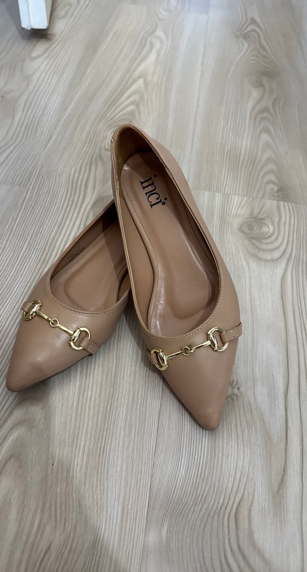 Bej renkli, deri malzemeden yapılmış, tokalı ve blok topuklu kadın babetleri. Klasik ve modern tarzı ofis için uygundur.