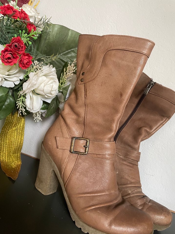 Bej Deri Tokalı Kadın Yüksek Topuklu Bot