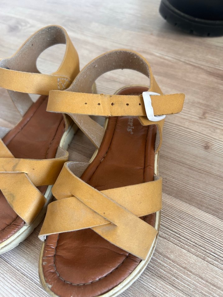 Bej deri cocuk sandaletler dolgu topuk ve tokalı kayışa sahiptir. Minimalist, bohem tarzıyla günlük kullanıma uygundur.