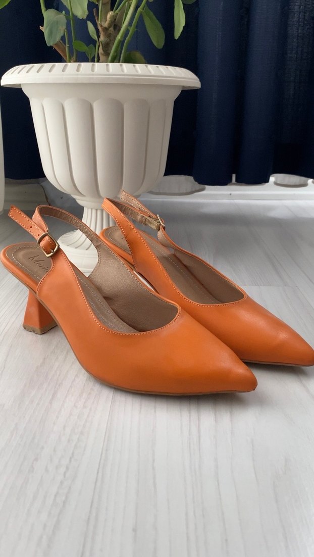 Turuncu deri, tokalı bantlı, blok topuklu kadın ayakkabısı. Klasik ve modern tarzı bir arada sunar, günlük kullanıma uygundur. Üç kısmında kullanıma engel olmayan deformasyon var.