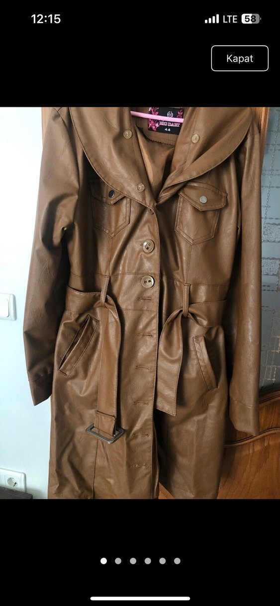Bej deri, düğmeli, uzun kesim kadın trençkot. Çıtçıtlı yakası ve kemeriyle şık ve parlak görünüme sahip.