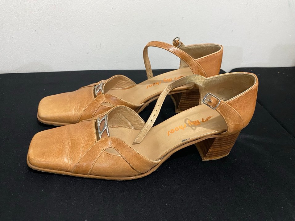 Bej deri kadın topuklu ayakkabılar, blok topuklu ve parlak yüzeye sahiptir. Vintage tarzda tokalı kayışları ile günlük kullanıma uygundur.
