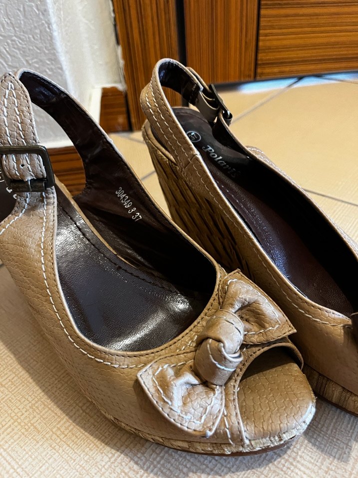 Bej deri yılan desenli dolgu topuklu ayakkabılar, tokalı ve günlük kullanıma uygun rahat tasarım. Trendy ve şık görünüm.