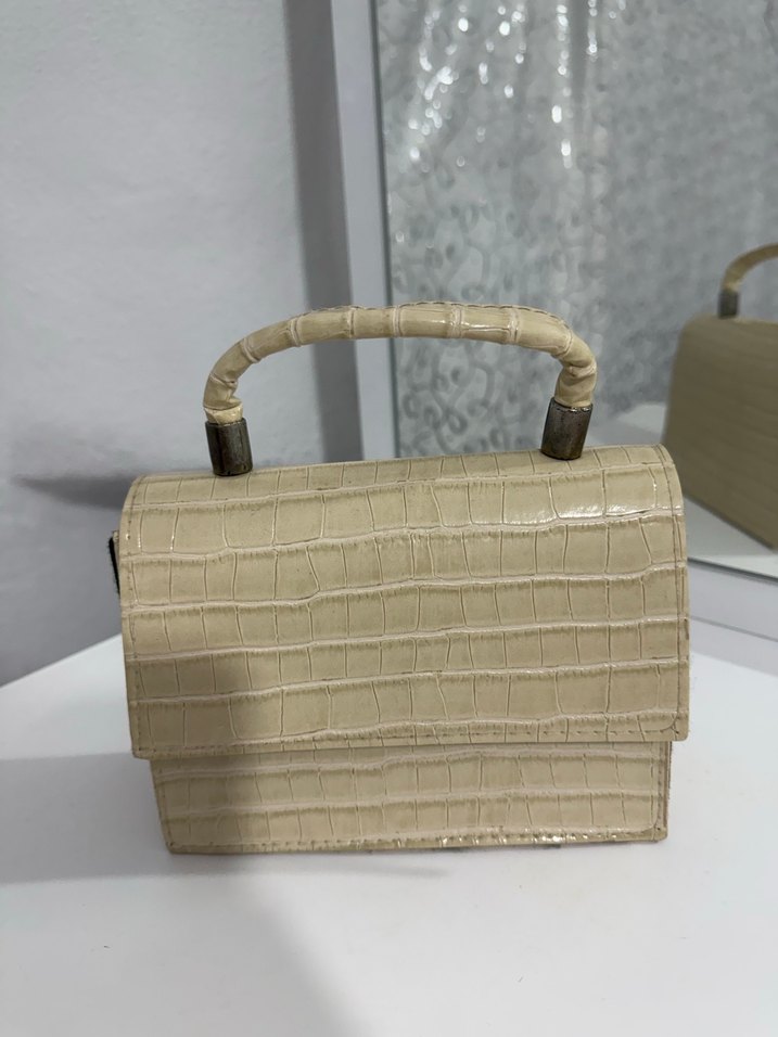 Bej deriden yapılmış, yılan deseni ve tokalı tasarıma sahip kadın çantası, günlük kullanıma uygun modern klasik tarzda.