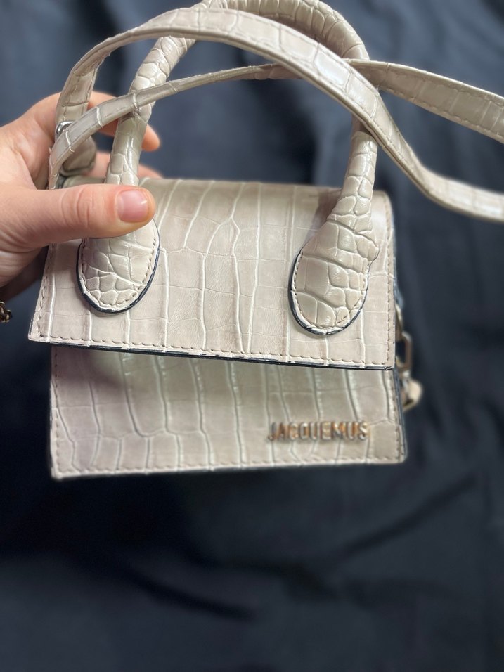 Beyaz deri, yılan deseni ve tokalı detaylara sahip ACCUEMUS markalı kadın çanta. Trend sokak stili için uygundur.