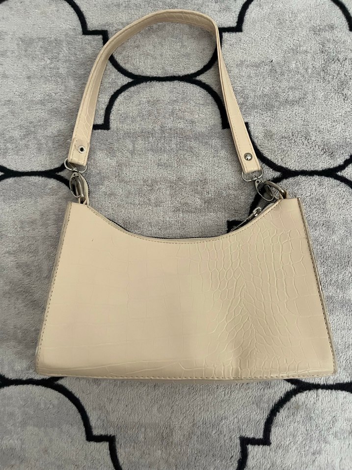 Bej deri omuz çantası, yılan desenli dokusu ve tokalı askısı ile günlük şık sokak tarzına uygun.
