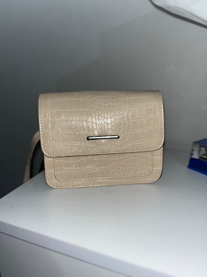 Bej renkte, yılan desenli deri kadın çanta, kemerli detaylı ve günlük kullanım için uygun, trend sokak stiline uyumlu. Uzun ve kısa askısı mevcuttur.