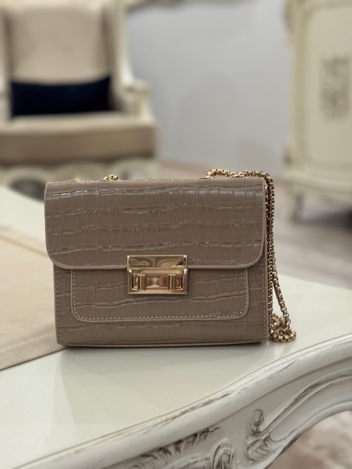 Bej Deri Yılan Desenli Zincir Askılı Çanta